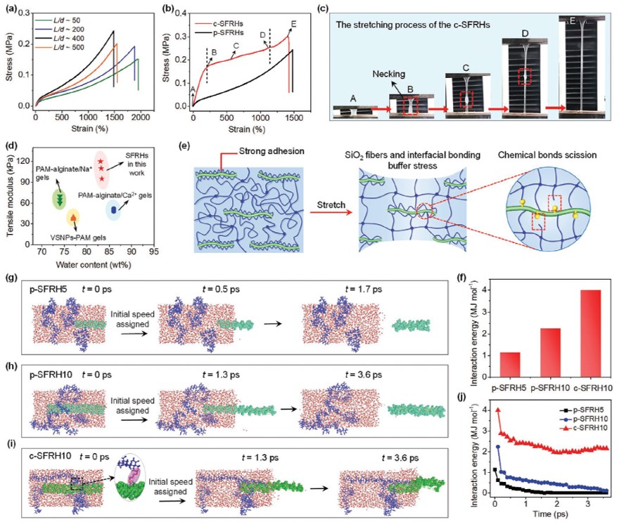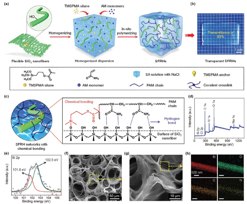 研究團(tuán)隊(duì)將二氧化硅納米纖維、乙烯基硅烷巧妙地整合入海藻酸鈉(SA)/聚丙烯酰胺(PAM)水凝膠中,制備了一種透明納米纖維增強(qiáng)的SFRHs水凝膠,其中PAM鏈通過硅烷共價(jià)連接到二氧化硅納米纖維上,形成堅(jiān)固的界面化學(xué)鍵。此外,二氧化硅納米纖維和PAM鏈之間的界面提供了非共價(jià)的相互作用(例如氫鍵),在拉伸過程中可能會斷裂和重組,耗散能量并使水凝膠網(wǎng)絡(luò)均勻化。