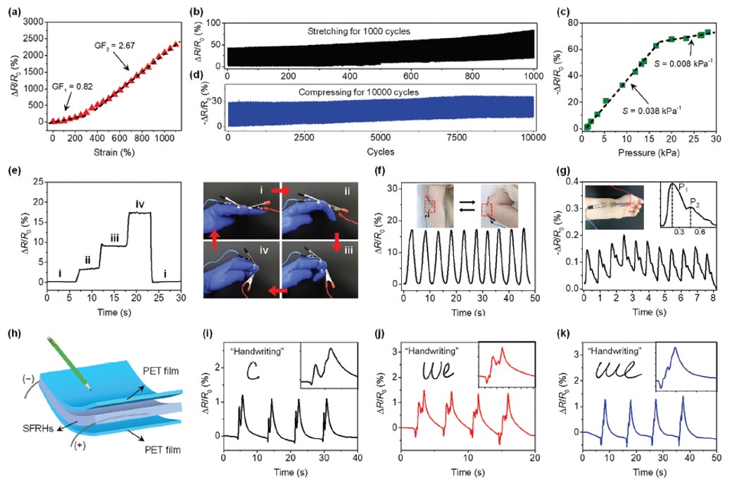 SFRHs在較寬的傳感范圍內(nèi)具有較高的靈敏度和循環(huán)穩(wěn)定性,可用于監(jiān)測人體運(yùn)動和脈搏跳動。SFRHs能夠有效監(jiān)測復(fù)雜而微小的外界刺激,比如書寫字跡等等,這在字跡防偽等領(lǐng)域有重要的潛在應(yīng)用價(jià)值。